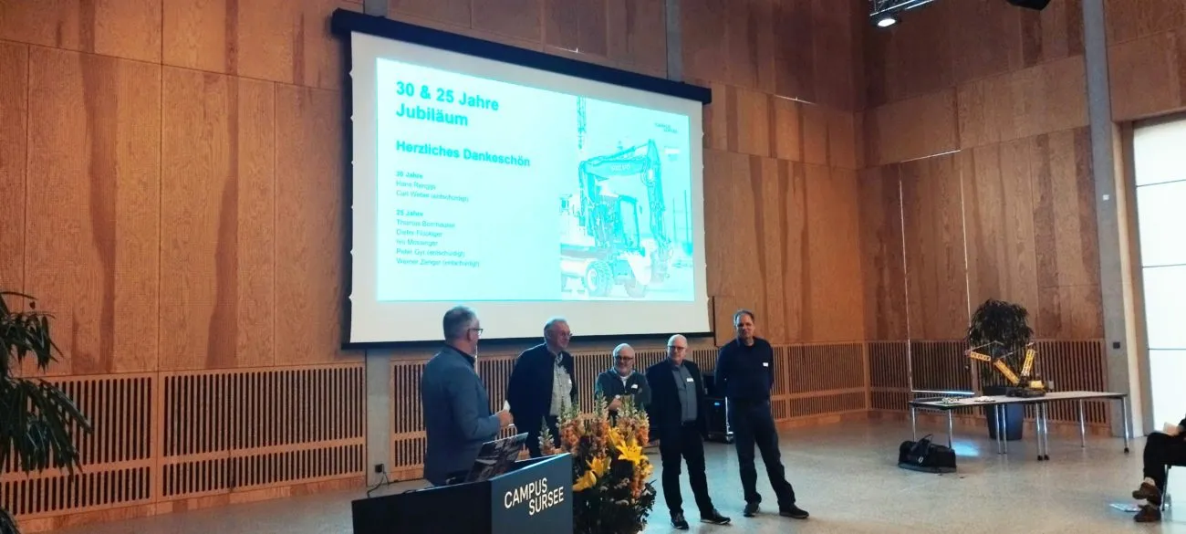 Mit vielen neuen Inputs und Ideen im Reisegepäck, trafen sich alle zum Abschluss der Tagesreise in der Eventhalle. Bei einem Stehlunch mit Spezialitäten aus Dänemark kamen alle auch in den kulinarischen Genuss von Feinem aus dem Norden und es wurde auch gratuliert und gefeiert. Eine Vielzahl von Ausbildungscoachs durften für ihren langjährigen und unermüdlichen Einsatz in der Bildung geehrt werden. Hervorheben möchten wir folgende Herren, sie sind bereits seit 30 Jahre, respektive 25 Jahre im Einsatz als Ausbildungsocachs am CAMPUS SURSEE: 30 Jahre: Hans Renggli, Carl Weber