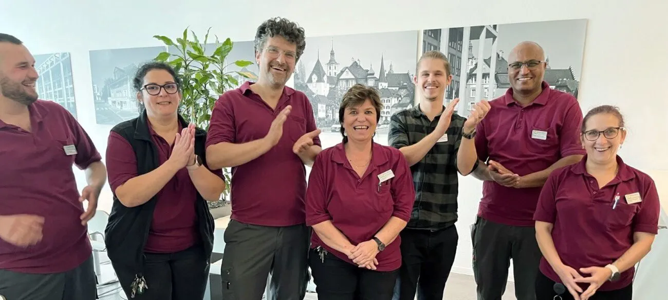 Zum Lachen war auch ein früherer Referent, damals hiessen die Ausbildungscoachs noch so, der sich immer wieder mal ein Spässchen erlaubte und beispielsweise die Putzwagen versteckte. Oder als ein «verirrter» Maurerlehrling splitternackt im Hotelflur vor ihr stand. «Alles nur ein Versehen», betont sie. Er hatte sich selber aus dem Zimmer gesperrt. Gerne erinnert sie sich auch an die geselligen Kegel-Meisterschaften im Gebäude 17. «Ja, damals stand hier tatsächlich noch eine Kegelbahn», schmunzelt sie. «Oder die zweitägigen Geschäftsausflüge – legendär.» Aber natürlich gab es in diesen 35 Jahren auch traurige Momente – und Parallelen zum Altersheim, ihrem früheren Arbeitgeber. Gute Kolleginnen und Kollegen, die verstarben oder die Firma verliessen. Die gute Fee Priska aber ist noch da und sorgt weiterhin für strahlende Räume und Gesichter am Campus.