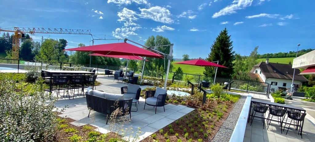 Durch den Neubau der Eventhalle und der Réception führt jetzt ein zusätzlicher Lift direkt auf die Dachterrasse beim Grill-Restaurant BAULÜÜT. Dies, damit auch Rollstuhlgäste ganz einfach zum BAULÜÜT gelangen. Diese neue Aussenfläche haben wir nun sehr gemütlich eingerichtet. In dieser Outdoor-Bar & Lounge geniessen Sie ab sofort romantische Sonnenuntergangs-Apéros oder ein gemütliches Feierabendbier mit herrlichem Pilatus-Blick. Oder Sie tanken die letzten Sonnenstrahlen nach einem intensiven Seminartag.