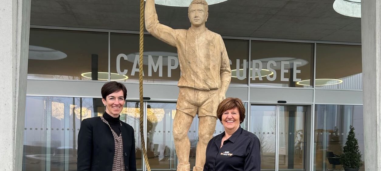 In knapp einem halben Jahr, Ende August, findet bei uns auf dem Campus die Seilzieh-Weltmeisterschaft statt. Die offizielle Statue «Ruedi der Fels» steht seit dem 13. Februar vor unserem Eingang. Ida Glanzmann, OK-Präsidentin und Mitte-Nationalrätin, enthüllte zusammen mit Andrea Ming, unserer Direktorin, das 490 Kilogramm schwere Kunstwerk aus Holz. Andrea Ming freut sich auf den Grossanlass im Sommer: «Der CAMPUS SURSEE und der Schweizerische Baumeisterverband als Sponsoren und Gastgeber sind stolz, diesen Anlass von internationaler Ausstrahlung mitzutragen. Die Bildung für das Bauhauptgewerbe, die wir auf dem Campus Sursee vermitteln, hat etwas sehr Bodenständiges, deshalb passt diese traditionelle Schweizer Sportart bestens auf unser Gelände.»