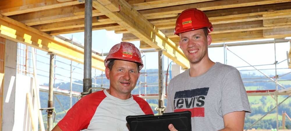 Bauführer Timo Wicki (rechts) mit Polier Markus Haas auf einer Arnet-Baustelle im luzernischen Malters.