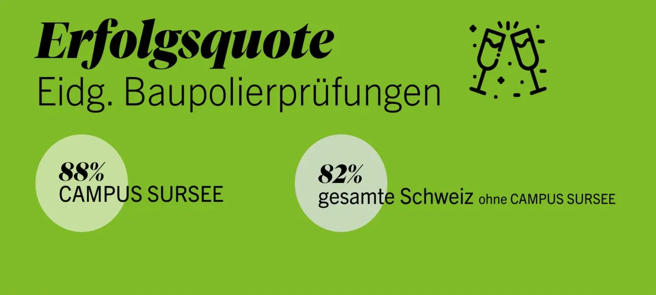Die 95 Absolventen der Baupolierschule des Campus Sursee haben mit der Erfolgsquote von 88% bewiesen, dass sie die Prüfungen mit Bravour bestanden haben. Sie erzielen seit Jahren eine konstant hohe Erfolgsquote aus gesamtschweizerischer Sicht. Die Quote dieses Jahr liegt gesamtschweizerisch, ohne Campus Sursee, bei 82%.
