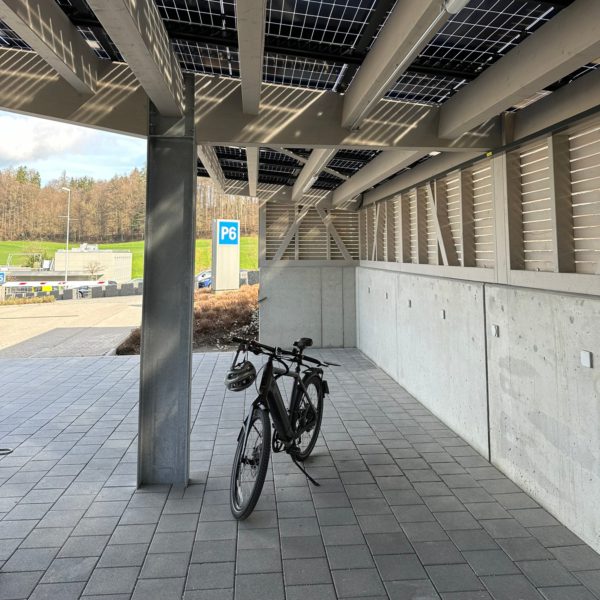 Mitten auf dem Campus-Gelände, auf dem Parkdeck P6, befindet sich der neue und nachhaltige Unterstand für die Zweiräder. Dieser ist in Beton- und Holzbauweise realisiert, als Dach fungiert eine Photovoltaik-Anlage mit Solarmodulen. Ein sogenanntes „zweigesichtigen Module“ nutzt nebst der direkten Sonnenstrahlung auf der Vorderseite auch das indirekte und diffuse Licht auf der Rückseite. Der Velounterstand bietet also nicht nur Schutz vor Witterungseinflüssen, die auf dem Dach eingebaute PV-Anlage produziert auch CO2 neutralen Strom. Die prognostizierte Jahresproduktion des Photovoltaik-Velounterstandes entspricht ca. 15’500 kWh.